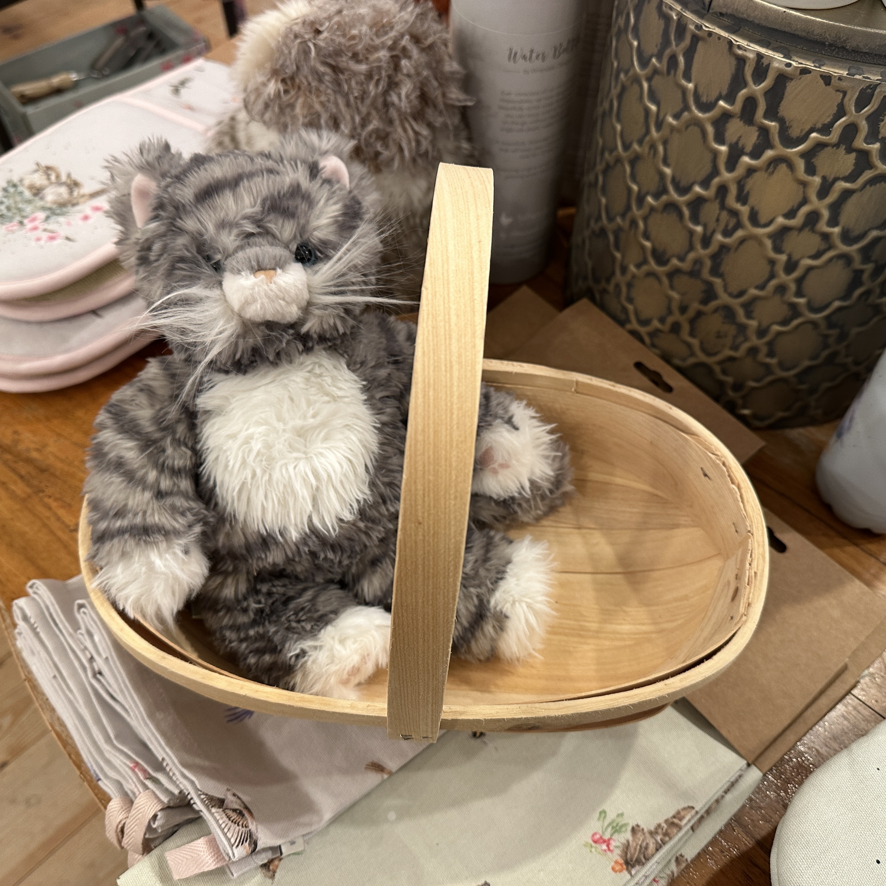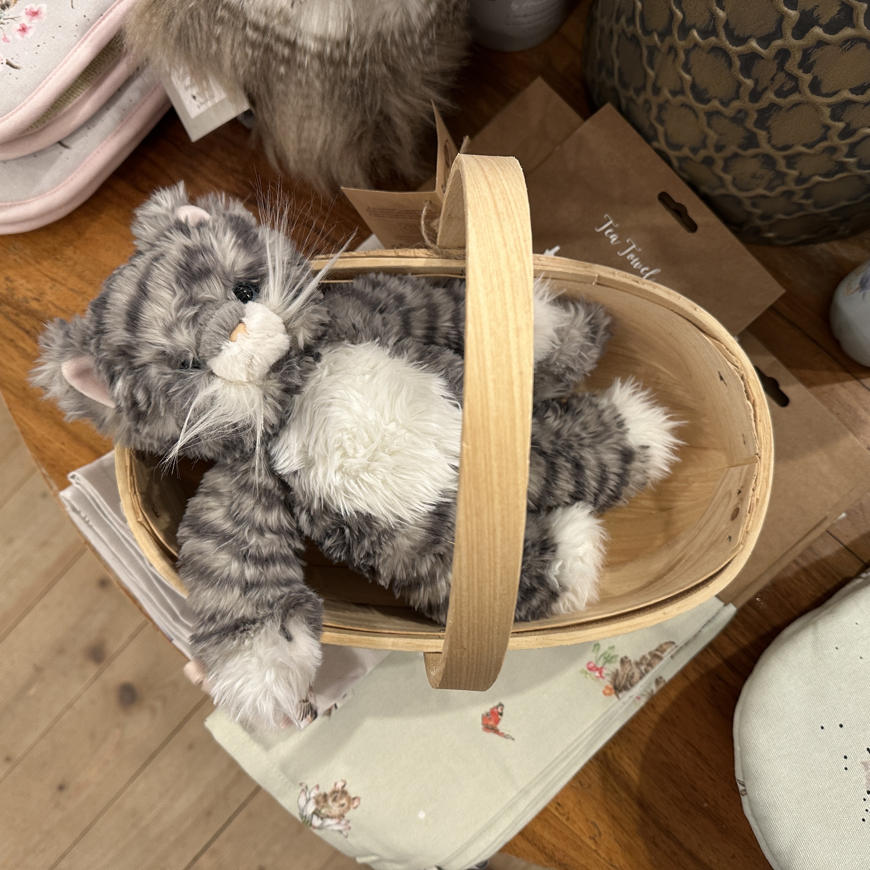 Esmeralda hat sich ein Beispiel an Seppl genommen und findet es im Körbchen auch gemütlich! Lernen Sie Esmeralda kennen, die wundervolle Katze aus unserer wunderschönen Plüschkollektion. Inspiriert von unserem „Marienkäfer“-Design ist Esmeralda mit einem gestickten Zaunkönig am Fuß und einem Geschenkanhänger mit Informationen über sie versehen. Dank sorgfältiger Stoffauswahl ist jede Plüschfigur unserer Kollektion ein Unikat und vereint hochwertige, weiche und griffige Materialien, die an das Tier und Hannahs Originalkunstwerke erinnern, die wir kennen und lieben. Ein tolles Geschenk für jeden Sammler der Wrendale-Reihe. Geeignet ab Geburt. Füllung aus Polyesterfasern. Katze: 200 mm x 160 mm x 120 mm. Korb: Maße: 33xx22x25cm (LxBxH). Es handelt sich bei diesen Körben zu diesem Preis selbstverständlich nicht um original Sussex Trugs, sondern um wesenlich einfachere Nachbildungen, die vor allem sehr dekorativ sind.
