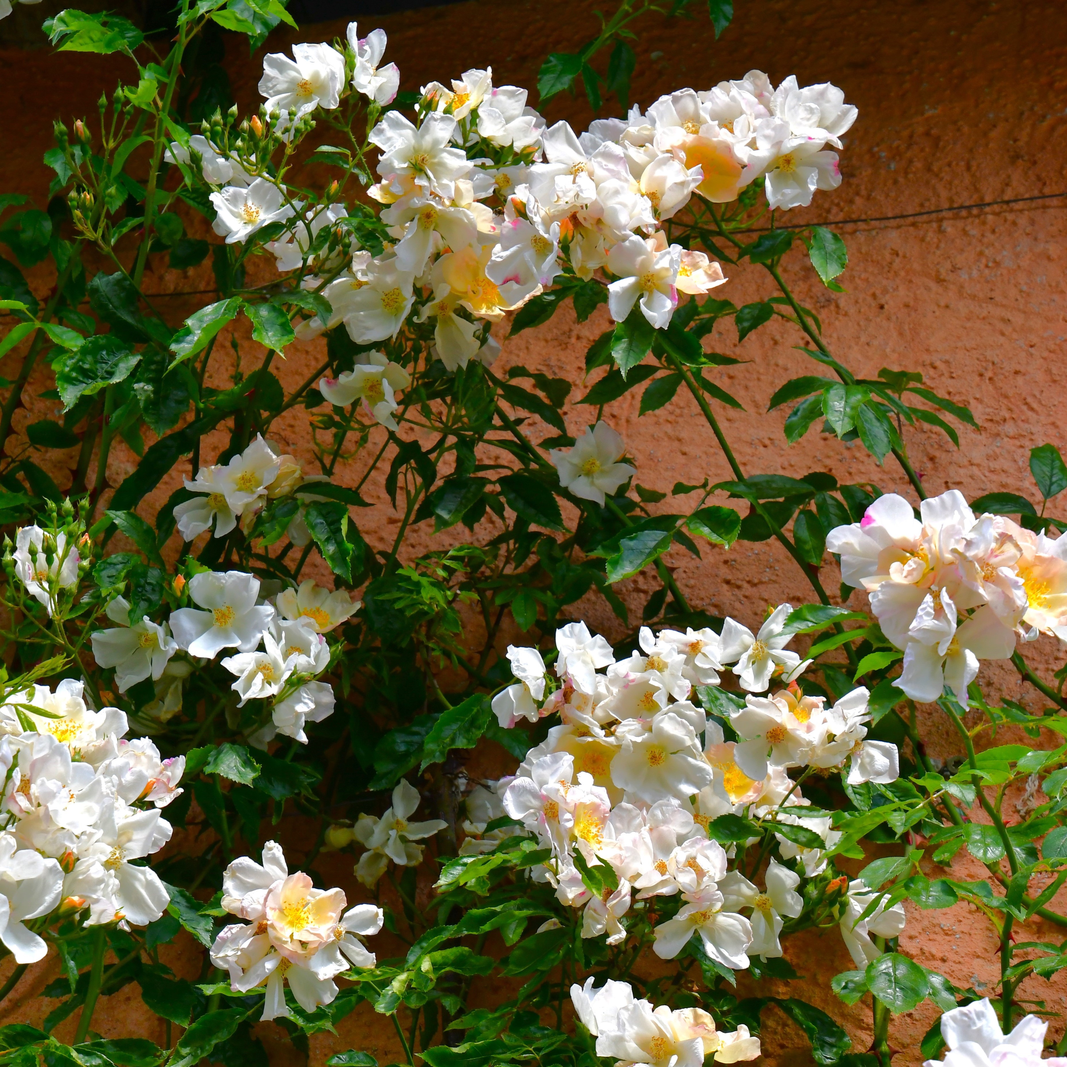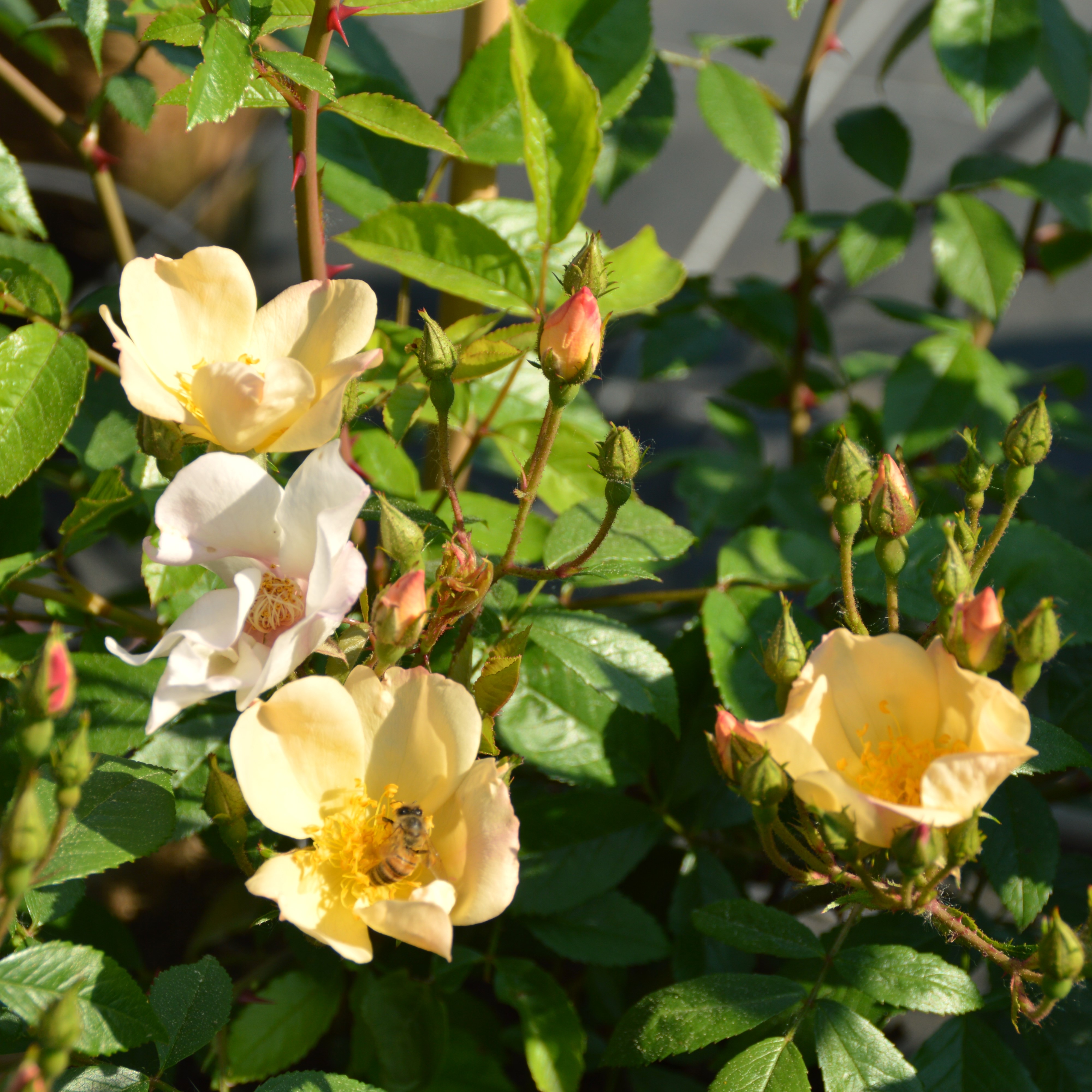 Anfangs sind die Knospen gelborange, im Aufblühen geht die Farbe dann erst ins Hellgelbe bis Apricot und schließlich in Cremeweiß über. Im Verblühen rollen sich die Blütenblätter an den Seiten ein und geben der Blüte somit ein interessantes, propellerartiges Aussehen. Wird Verblühtes nicht kontinuierlich ausgeschnitten, bilden sich schnell zahlreiche kleine rote, sehr hübsche Hagebutten. Ab Mitte August würde ich aber raten, die Hagebutten reifen zu lassen. Alle öfterblühenden Rambler und Patio-Climber von John Scarman zeichnen sich dadurch aus, dass sie immer wieder bereitwillig neue, junge Triebe aus der Basis hervorbringen, so dass ein flächig dichter Bewuchs erreicht wird und die Rose nicht von unten verkahlt und nur noch oben blüht. Katja's Favorite ist sehr pflegeleicht, winterhart und resistent. Sie ist sehr gut für romantische Blickfänge: Säulen, Obelisken, kleine Bögen und kleine Bäume geeignet.