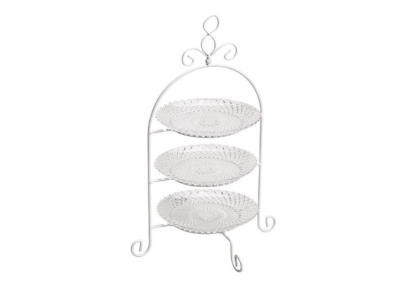 Weiße Etagere mit 3 Etagen, bestückt mit Glastellern mit Rautenmuster.